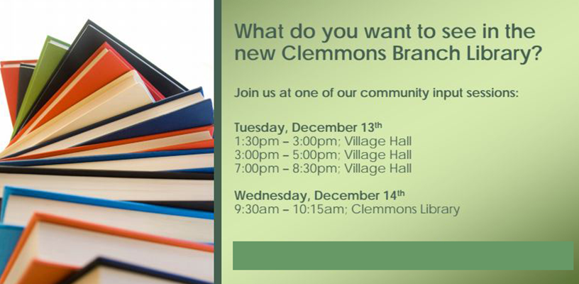 We want to know what you would like to see in a new Clemmons Branch Library. You are invited to attend one of four upcoming public input sessions to share your thoughts and suggestions with us.
