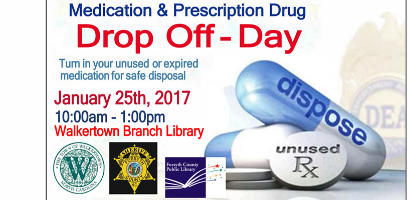 Medicine Drop-Off Day is Wednesday, January 25th. Come to the Walkertown Branch library between 10 am and 1 pm and turn in your unused or expired medication for safe disposal. The event is sponsored by the Town of Walkertown.