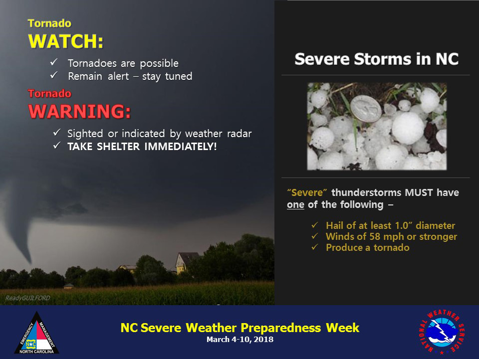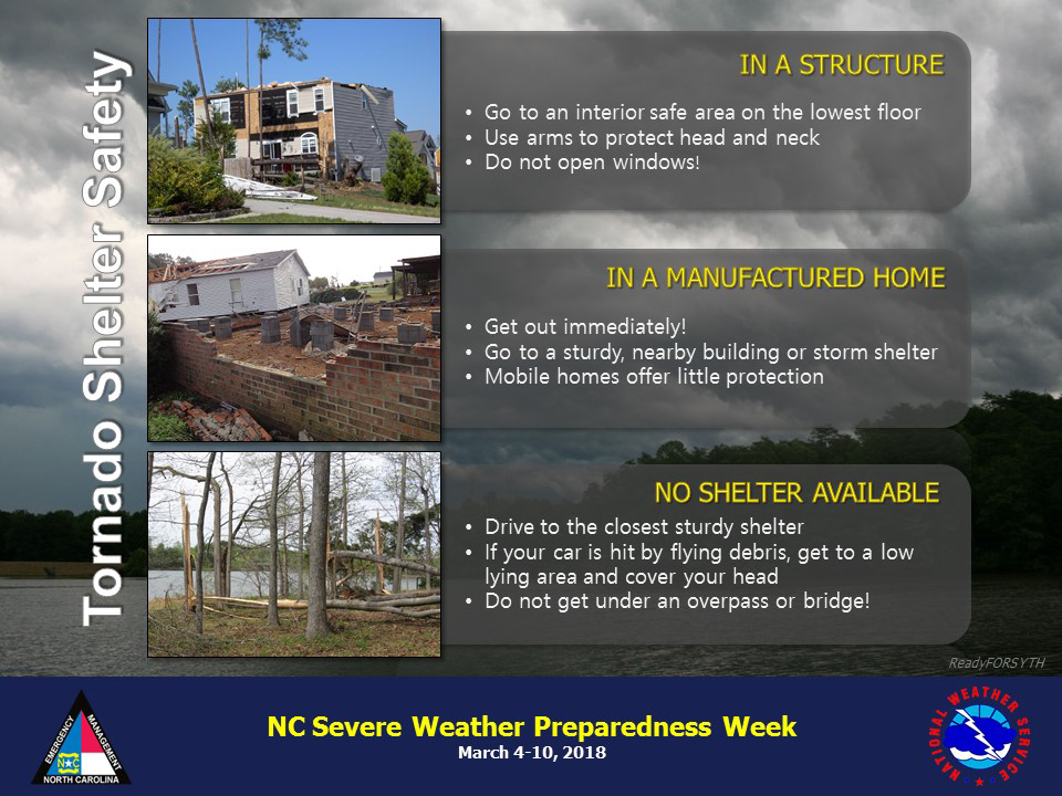 March 4-10 is Severe Weather Preparedness Week in North Carolina. Forsyth County officials urge residents to participate in the annual statewide tornado drill March 7 to practice their emergency plan in case severe weather strikes our state.
