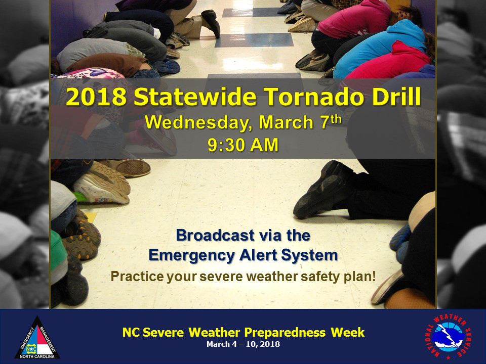 Forsyth County schools and government buildings will participate in the statewide tornado drill Wednesday, March 7, at 9:30 a.m. The National Weather Service (NWS) will broadcast the drill over NOAA weather radio stations and the Emergency Alert System.