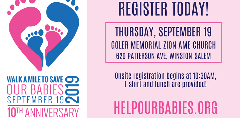 September is Infant Mortality Awareness Month, and this year the Forsyth County Infant Mortality Reduction Coalition is pleased to announce the 10th Annual Walk a Mile to Save Our Babies event on Thursday, September 19th. During this time, the Coalition and walk participants will be commemorating all the infants lost in in 2017 in Forsyth County. The event will also promote the many things we can do as a community to help keep our babies safe AND healthy!
