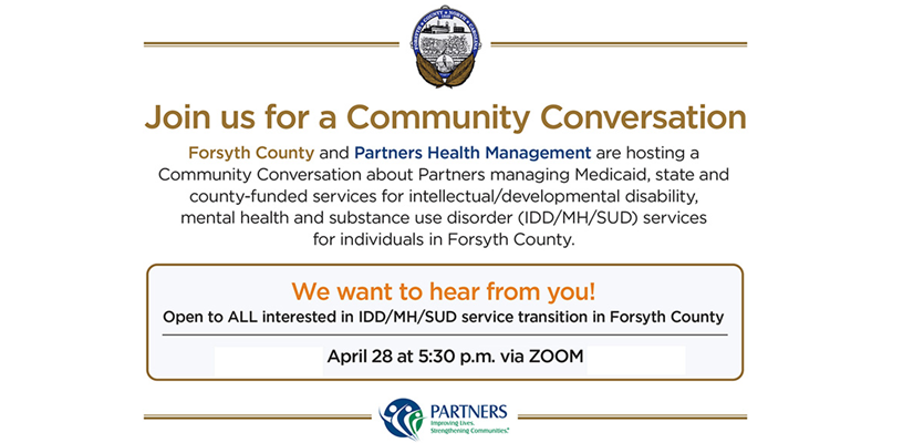 Forsyth County and Partners Health Management are hosting a Community Conversation about the upcoming transition from Cardinal Innovations Healthcare to Partners managing intellectual/developmental disability, mental health and substance use disorder services for individuals in Forsyth County that are funded by Medicaid, state and county funds. The event will be April 28 at 5:30 p.m. on Zoom. Register online at: http://bit.ly/PartnersConversation.