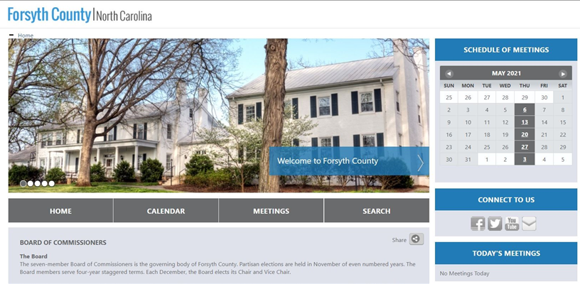 The new portal can be accessed at https://coforsythnc.civicweb.net/Portal/ or by going to the commissioners’ page at https://forsyth.cc/Commissioners/. The new site contains meeting schedules, agendas, minutes, and videos, along with information on each county commissioner.