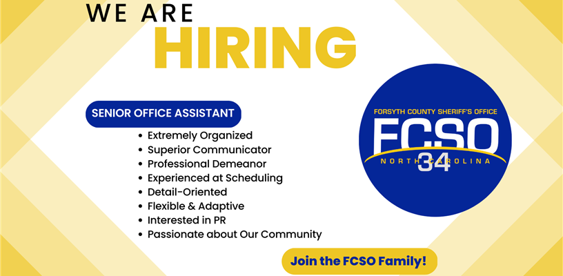Are you highly organized, a skilled communicator, and passionate about our community? We are hiring a Sr. Office Assistant who will be assigned to the Public Relations Team and Community Outreach Unit. This position will schedule and manage multiple calendars, and will entail a high level of interaction with our community. The environment is often fast-paced, requiring flexibility and open communication. For more information and to apply, visit: https://www.governmentjobs.com/careers/forsythcountync/jobs/3855670/sr-office-assistant-public-relations