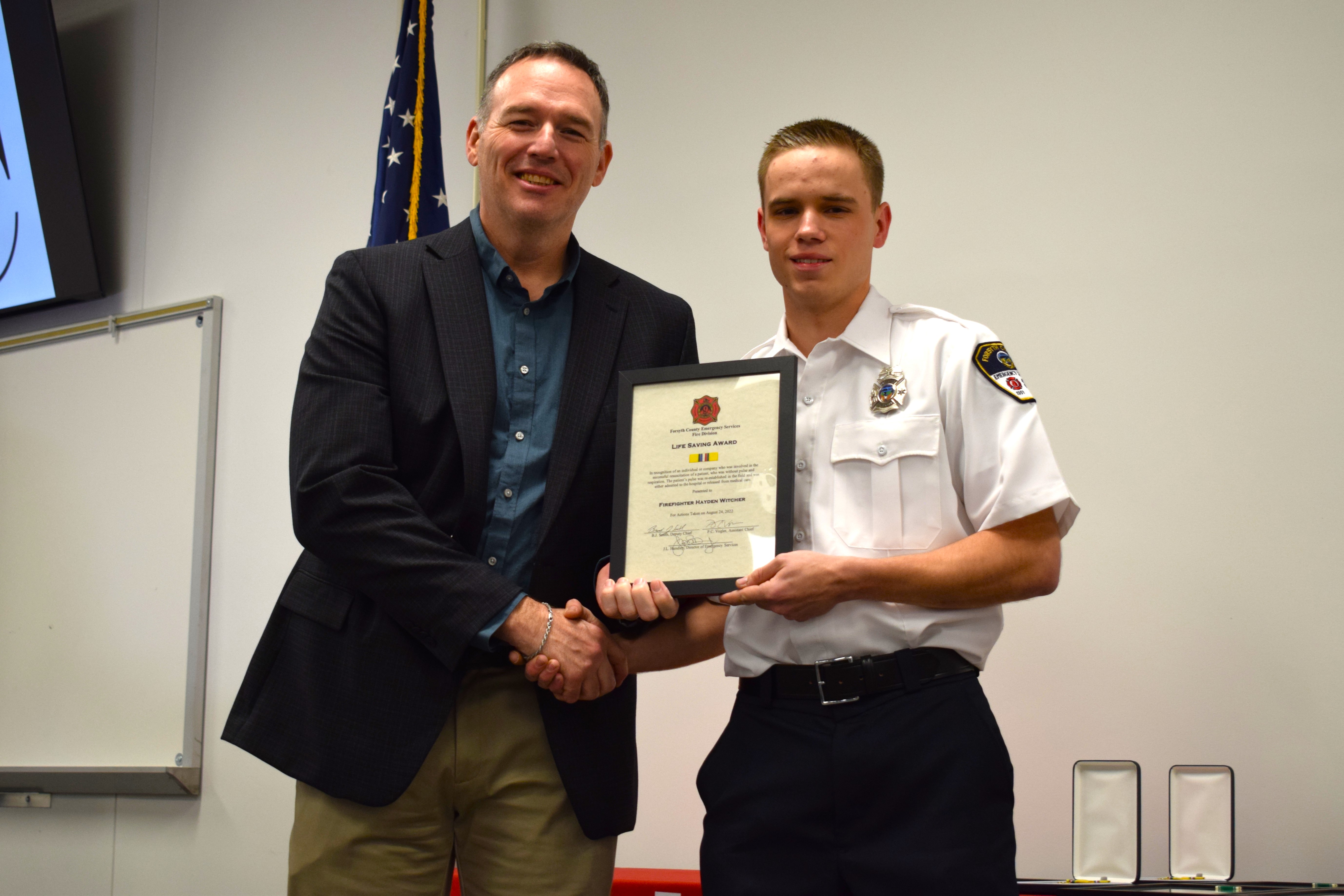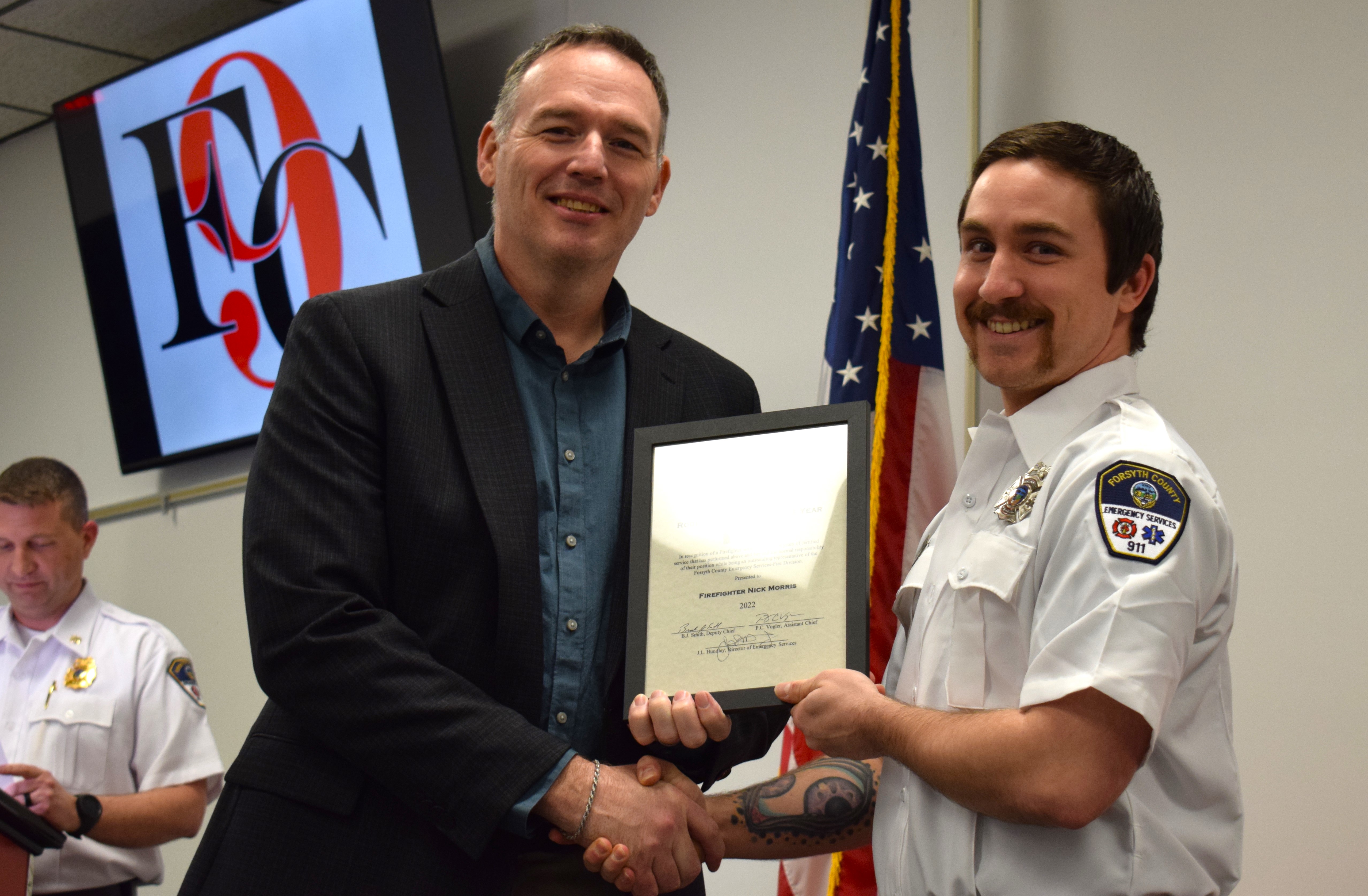 Firefighter Nick Morris receives a Rookie Firefighter of the Year