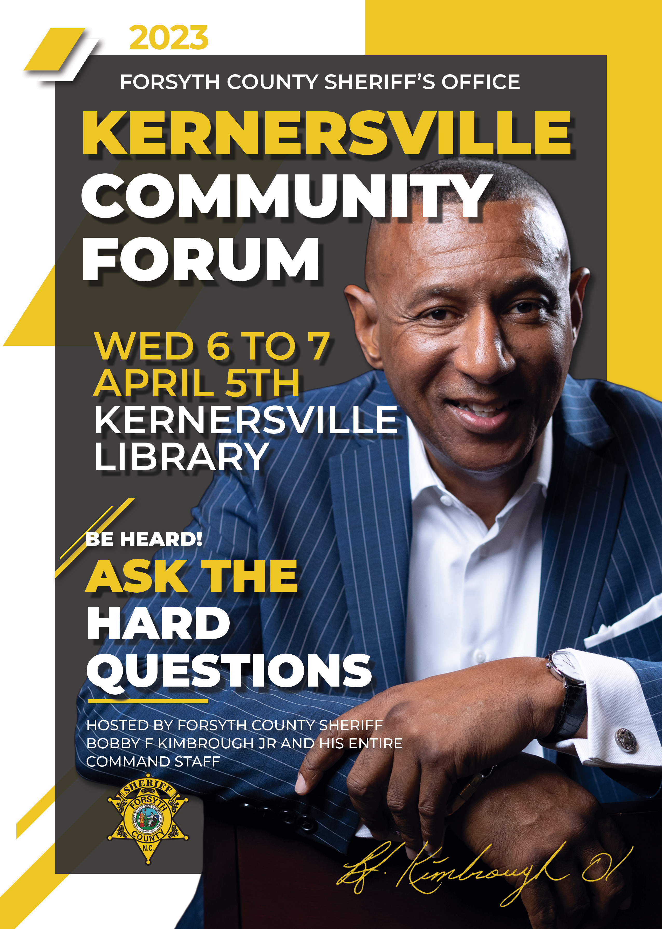 Come see us at our Community Forum in Kernersville! We want you to show up and ask the hard questions. Sheriff Kimbrough and the Forsyth County Sheriff's Office Command Staff will be present to talk with you about the upcoming year. The Community Forum will be held Wednesday, April 5th, from 6 to 7 pm in the Paddison Memorial Branch Library Auditorium, located at 248 Harmon Lane in Kernersville. ALL community members are welcome!
