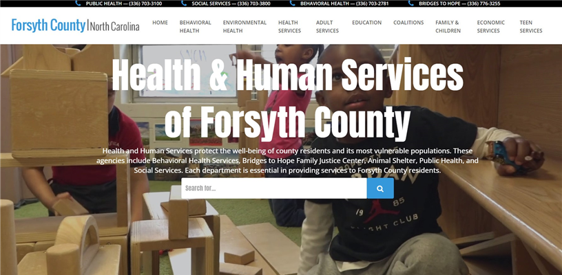 Forsyth County Government now has a new Health and Human Services website that includes all the services for the departments of Public Health, Social Services, Behavioral Health Services, Bridges to Hope Family Justice Center and the Animal Shelter.