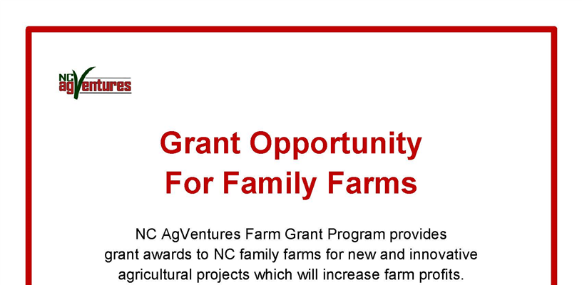 NC AgVentures is an NC State Extension grant program that provides grants to North Carolina family farms, and community organizations such farmer associations and farm co-ops to develop new and innovative agricultural projects which will increase farm profits. This is a great opportunity for any producer who is thinking of diversifying, improving, or expanding their operation.