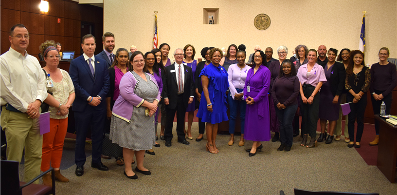Commissioner Tonya McDaniel presented a resolution to Bridges to Hope Family Justice Center Director DeWanna Hamlin, who was joined by Forsyth County DA Jim O'Neill and other community partners.
