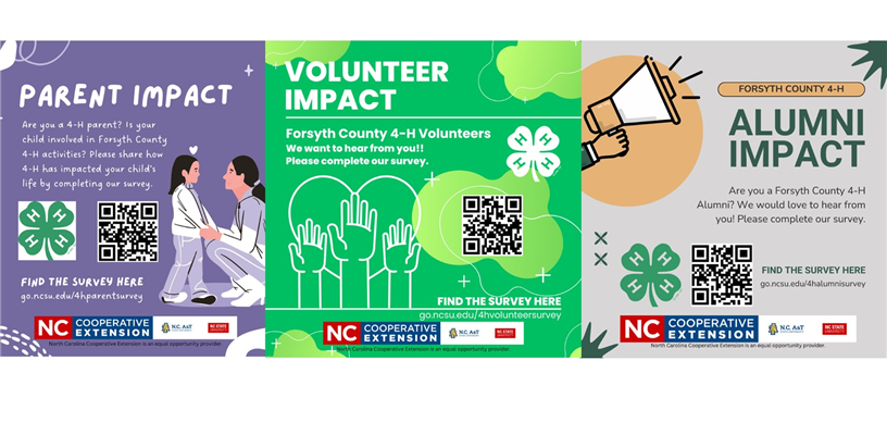 We hope that your 4-H experience in Forsyth County is/was great. Whether you have just joined 4-H or were involved for years, we would love to hear from you and learn about your experiences. Please take a few minutes to complete the appropriate survey(s) before November 30.