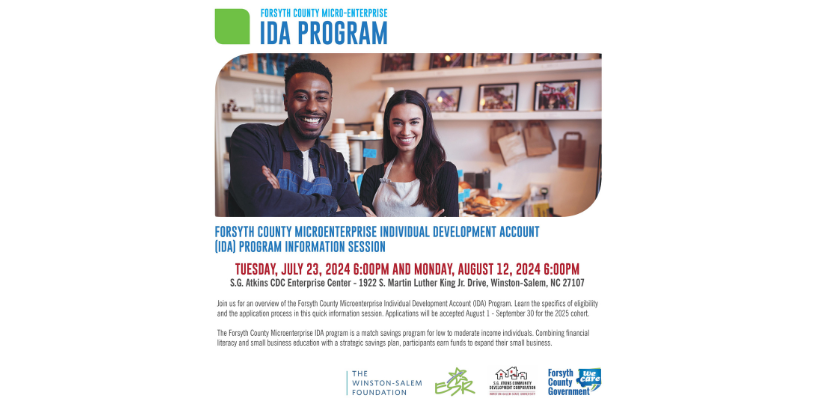 Forsyth County Community & Economic Development will be accepting applications for its upcoming Micro-Enterprise Individual Development Account (IDA) Program beginning August 1 through September 30. The IDA program is a match savings program for low to moderate income persons who operate a business in Forsyth County. Participants will receive financial literacy education provided by Experiment in Self Reliance (ESR) and small business training provided by S.G. Atkins Community Development Corporation. Upon completion of the program, participants will be eligible to receive matching grants up to $16,000 toward an approved business asset.