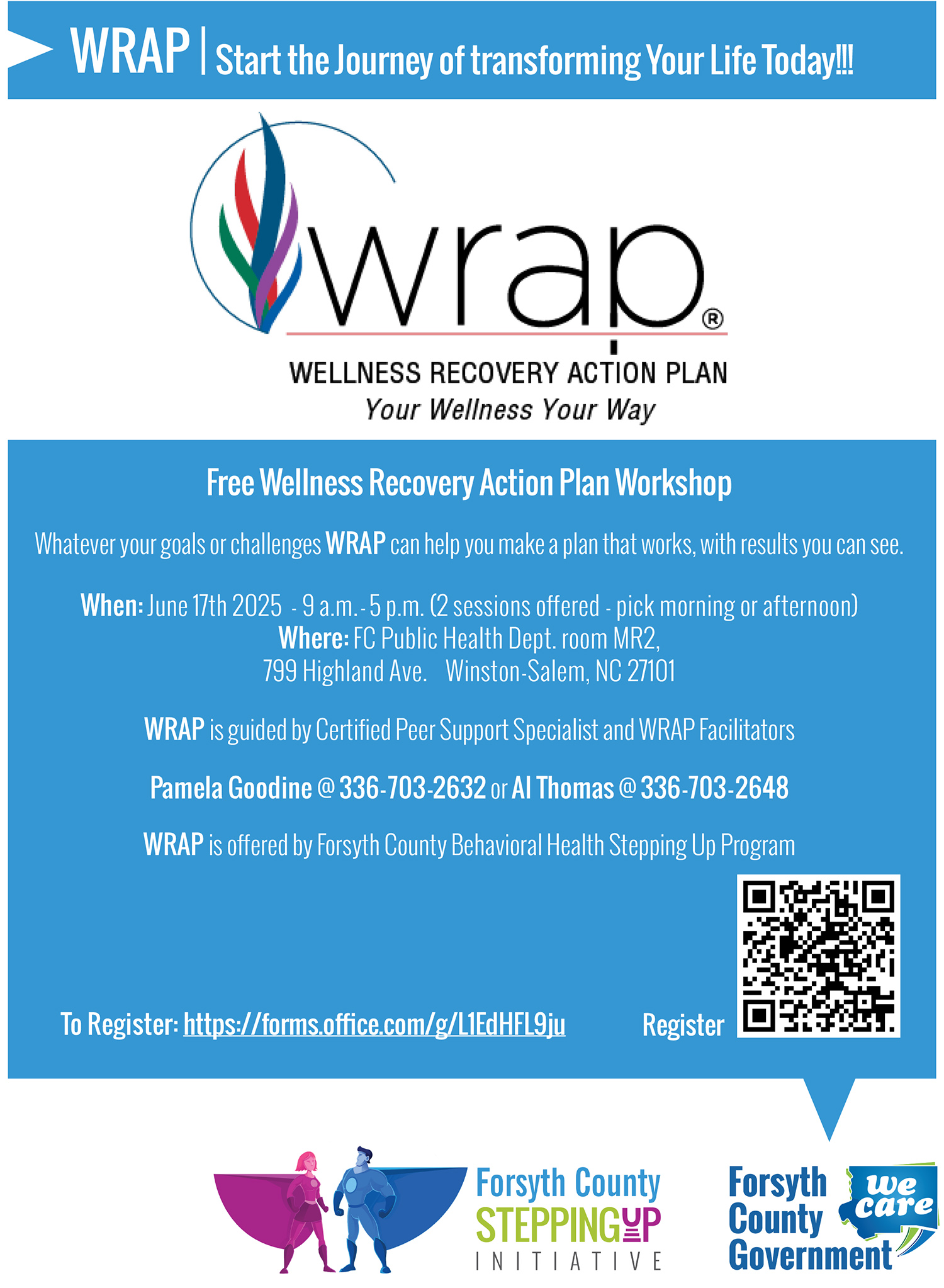 The Stepping Up Initiative Peer Support Specialists are excited to host their annual Wellness Recovery Action Plan (WRAP) Workshop, open to the entire community! WRAP is a simple yet powerful evidence-based process that supports individuals in taking control of their wellness and building the life they want.