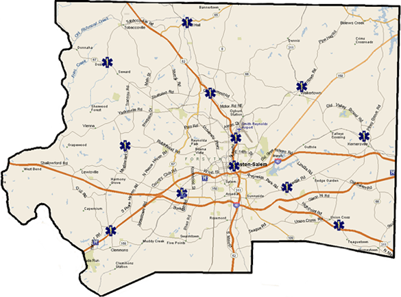The FCES - EMS Division operates ambulances from twelve (12) different stations strategically located around Forsyth County. The following map shows the location of each station: